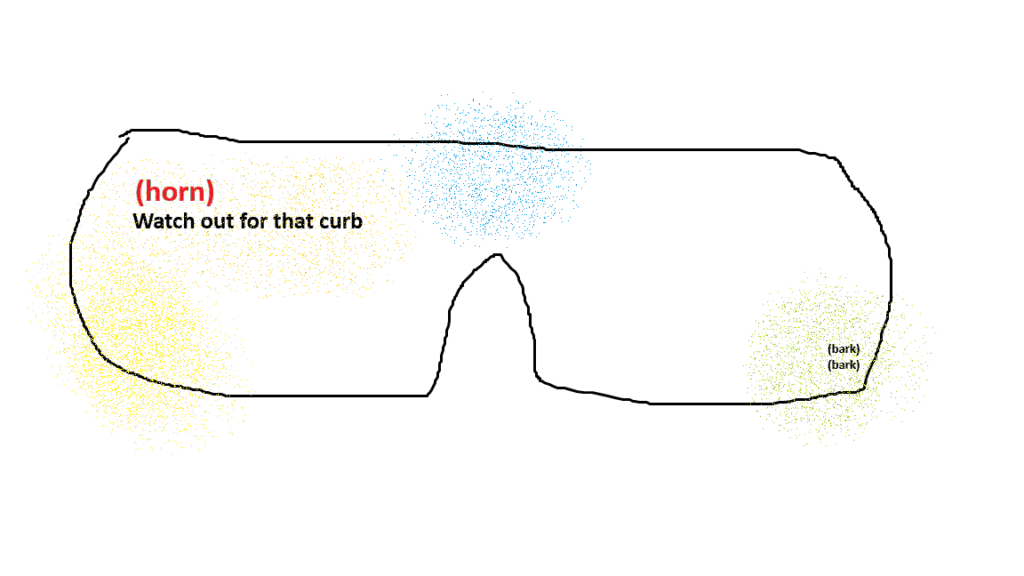 In this crudely drawn mockup, you see in the blue that something in front is a low pitch sound, coming from directly in front. It recognized a horn sound coming from the left front and made it red to indicate a warning. Someone in that direction said “watch out for that curb”. There is a high pitched noise coming from the left and behind indicated by the yellow. A dog is barking in the distance to the right and behind.